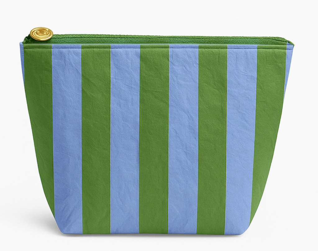 Sustainable tyvek outer fabric w/ waterproof lining on the inside. Resin zipper w/ gold pull Size: 9"x6"